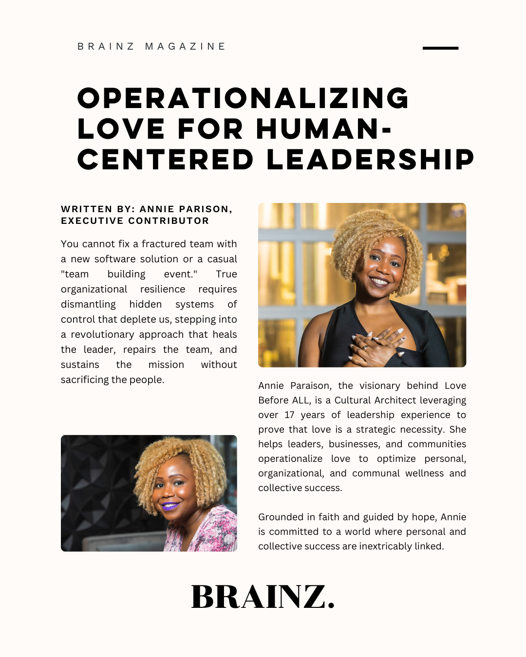 The Brainz Magazine exclusive interview on the new era of human-centered leadership diving deep into how to transform unconscious patterns into conscious compassion by making love a strategic discipline.