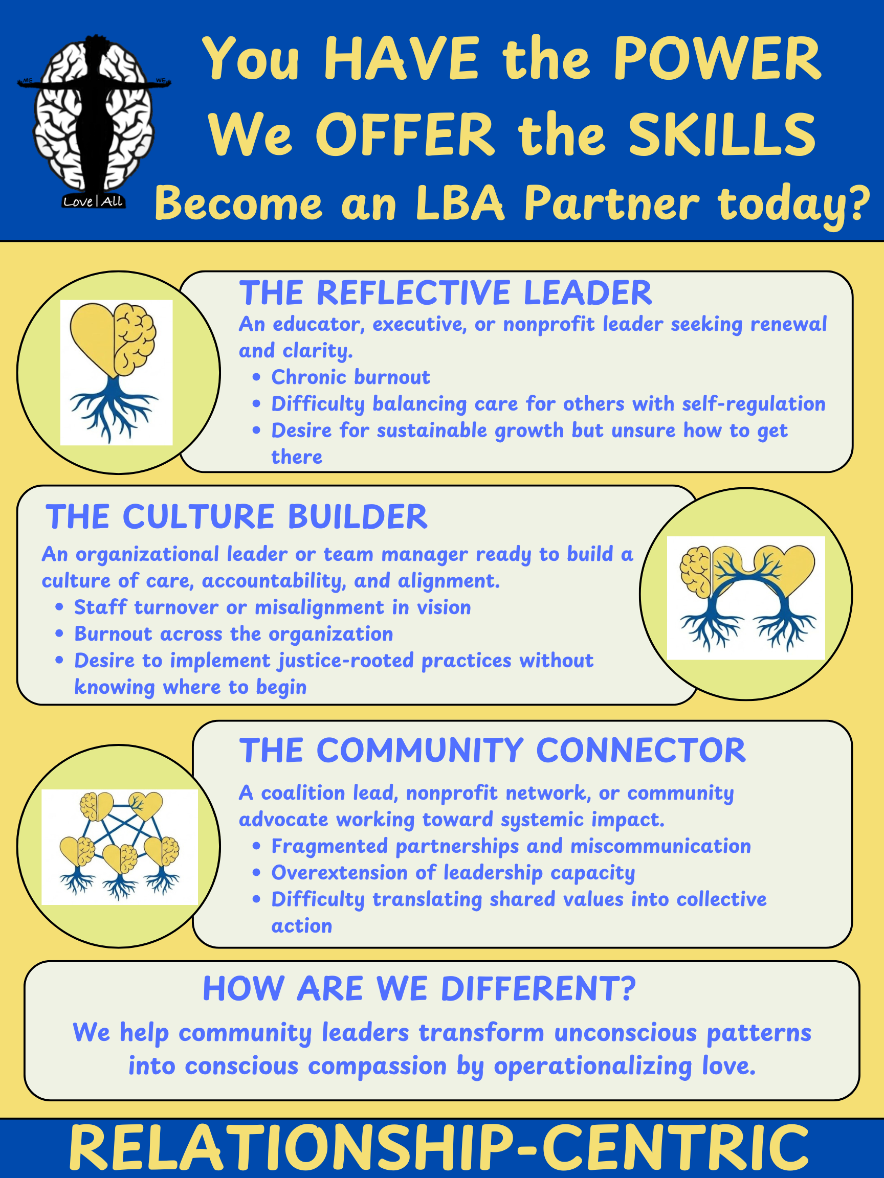 LBA activates relationship power and the capacity within people and systems to create harmony and healing through connection. Our framework, built on growing compassion from the inside out, guides this transformation. We help our clients move from insight to embodiment by facilitating the design of strategies, structures, and cultures that sustain wellness and justice over time. Through this approach, growth becomes relational, intentional, and lasting.